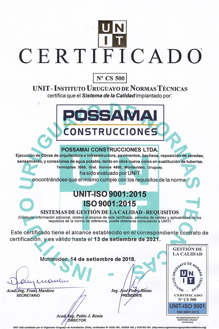 Possamai Construcciones Ltda. recibió por parte del Instituto Uruguayo de Normas Técnicas (UNIT) la certificación en gestión de la calidad bajo las normas UNIT-ISO 9001:2015. La política de calidad establece el compromiso de la dirección para suministrar productos constructivos que satisfagan las necesidades de sus clientes, a precios competitivos, protegiendo la integridad de sus trabajadores, cuidando el medio ambiente y previniendo la contaminación.
